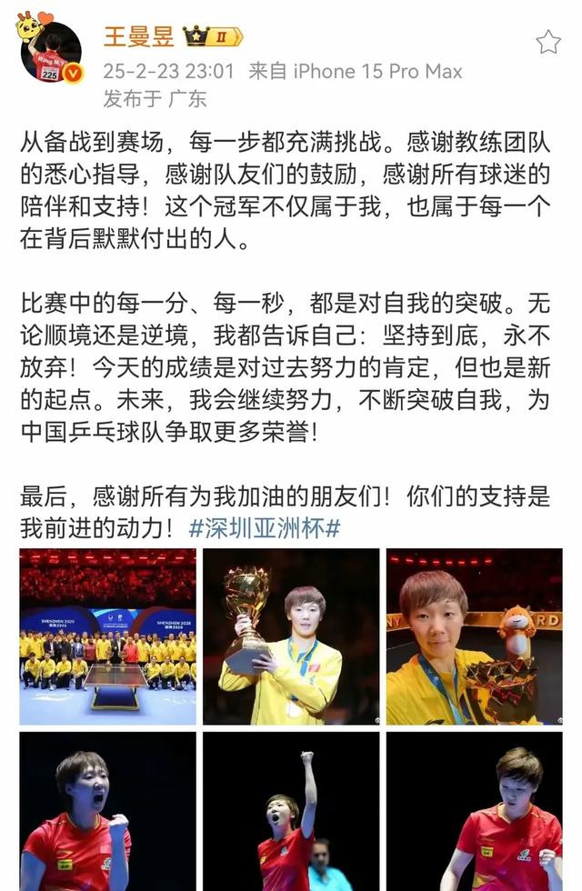夺冠后的王曼昱,发文激励自己。强调“比赛的每一分、每一秒,都是对自我的突破”,重点强调自我激励“坚持到底,永不放弃!”,时刻鼓励自己,继续努力,突破自我!